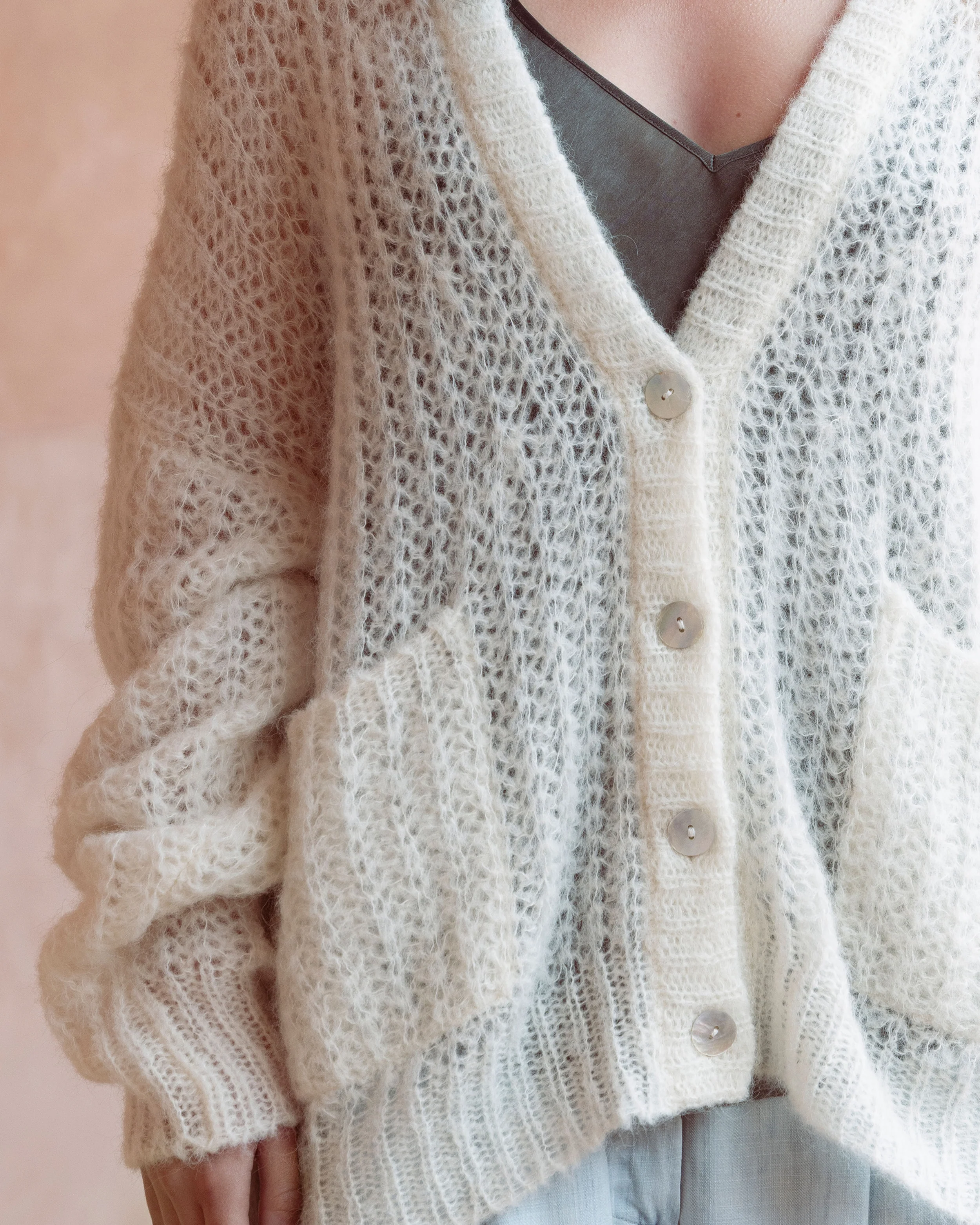 Cardigan en fil d'alpaga brossé de couleur ivoire, à la douceur enveloppante et au charme intemporel. Sa coupe classique est revisitée avec un volume légèrement oversize pour une allure décontractée et élégante. La maille côtelée et ajourée, souple et moelleuse, confère une sensation de confort absolu. Deux poches plaquées viennent enrichir le devant du modèle, apportant une touche de praticité et de raffinement.