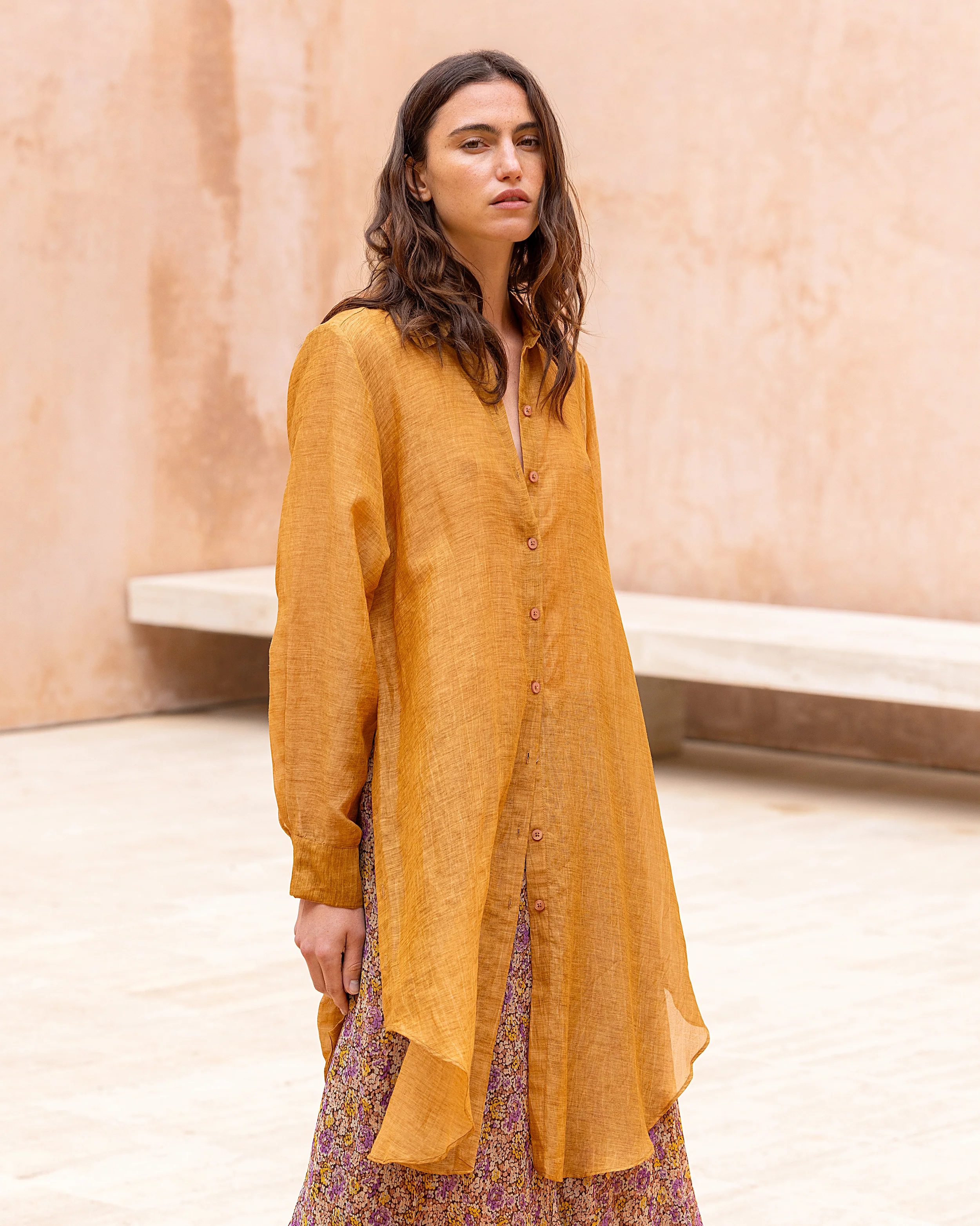 Longue chemise fluide aux teintes ocre chaleureuses, confectionnée dans un mélange léger de coton et de soie. Sa coupe légèrement évasée s’anime d’un jeu subtil de boutonnages sur les côtés créant une fente à moduler selon l’envie. Les manches longues et le dos légèrement plus long apportent une touche d’élégance décontractée à cette pièce facile à porter.