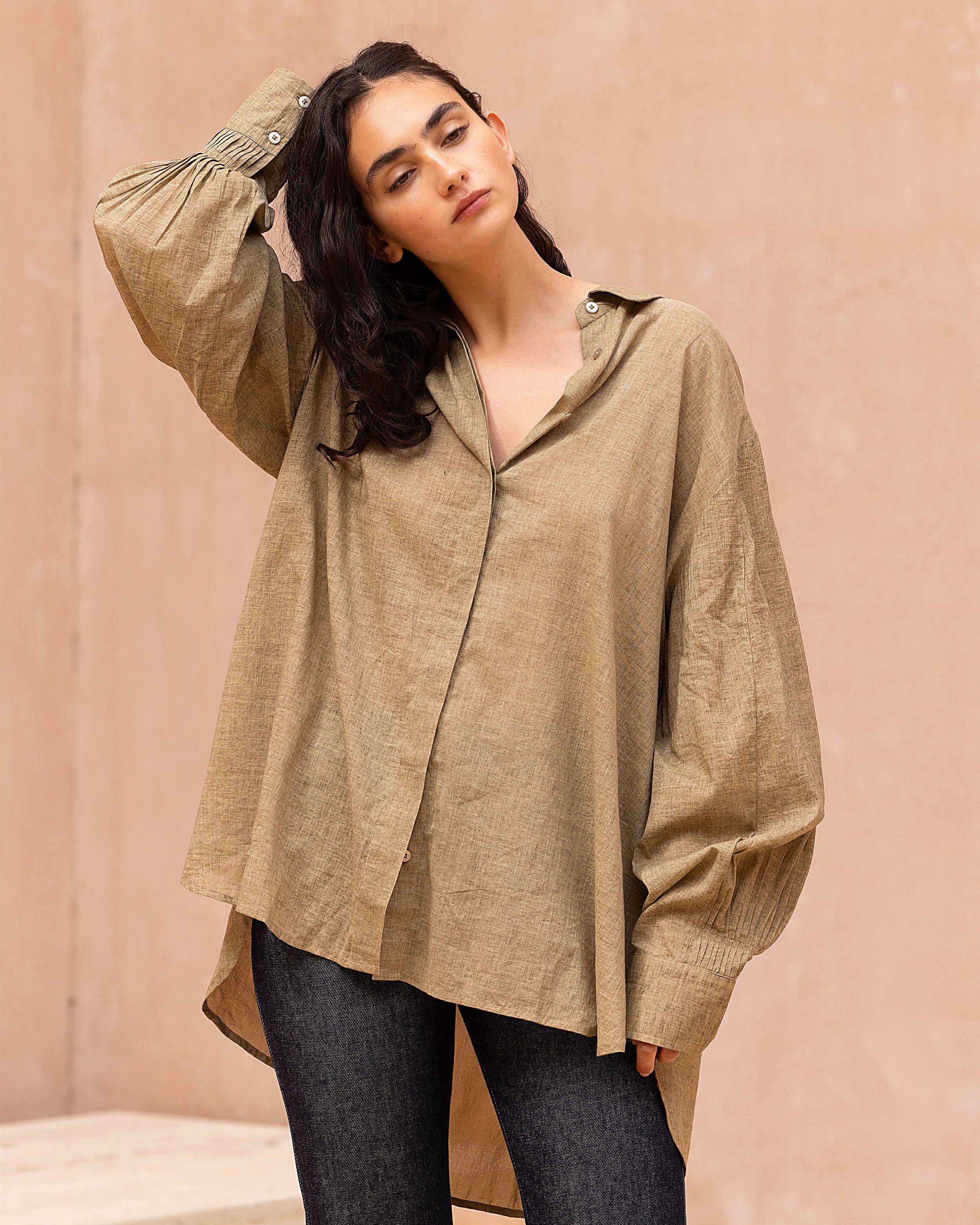 Chemise en voile de coton teint selon un procédé pigment dye, qui révèle des nuances subtiles de beige et une texture légèrement vivante. Sa coupe légèrement oversize est réhaussée d’un jeu subtil de plis plats d'aisance et de découpes qui structurent les emmanchures et soulignent le dos. Les longues manches apportent équilibre et fluidité à cette pièce à la fois simple et travaillée. Le dos est légèrement plus long.