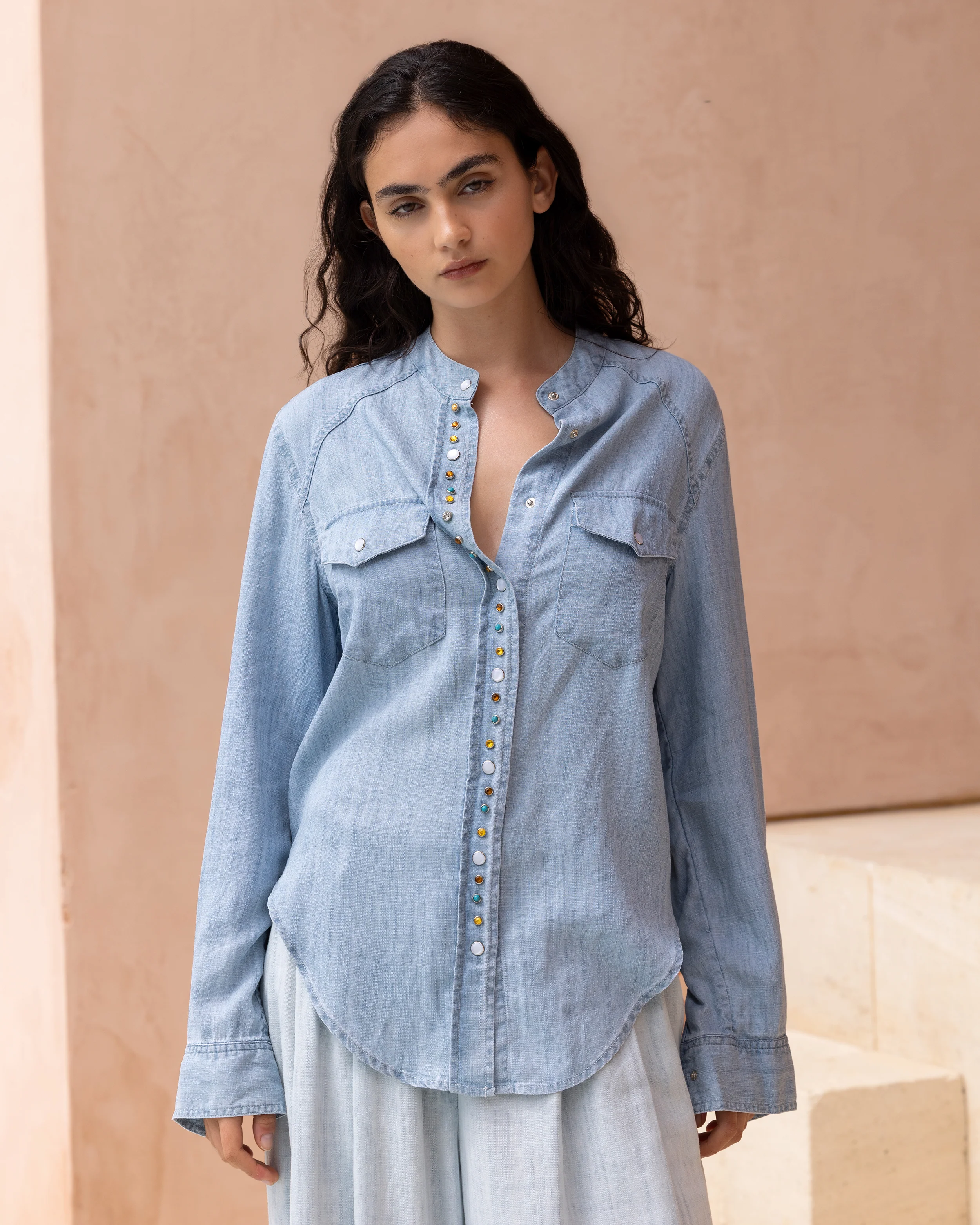 Cette chemise en tencel et lin séduit par sa coupe fluide et son allure western subtilement revisitée. Sa teinte bleu ciel apporte une touche de douceur, tandis que les boutons-pression colorés et nacrés viennent dynamiser l’ensemble avec une note d’originalité. Son encolure simple et ses poches à revers renforcent son esprit authentique, tandis que sa coupe arrondie et ses manches longues lui confèrent une élégance décontractée.
