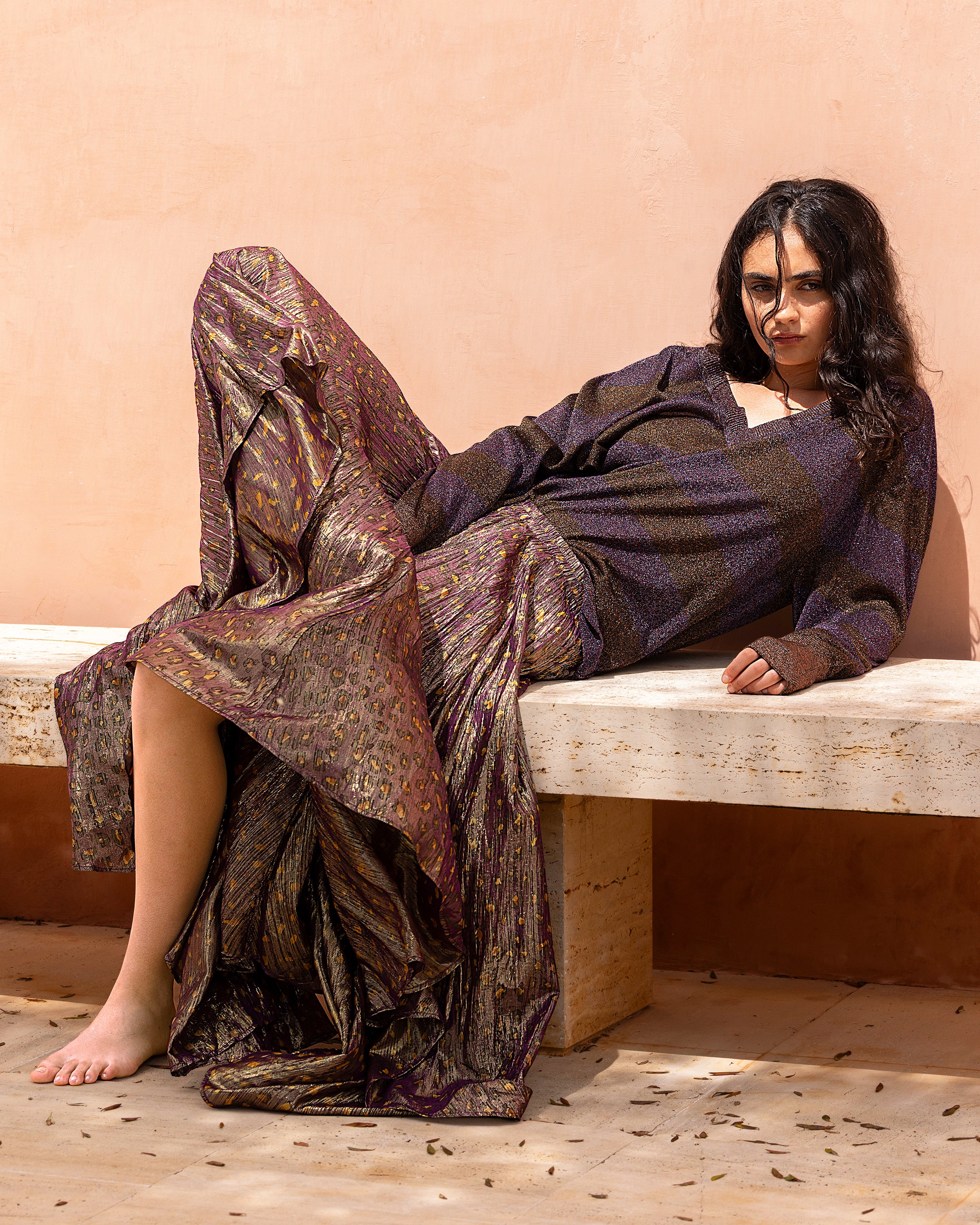 Jupe longue au charme vaporeux, confectionnée dans une viscose chiffon légère traversée de fins fils lurex scintillants. Son imprimé sur une base violacée est ponctué de dessins ocre doré aux reflets précieux. La coupe, souple et fluide, se termine par un bas légèrement déstructuré. Taille élastique pour un confort discret.