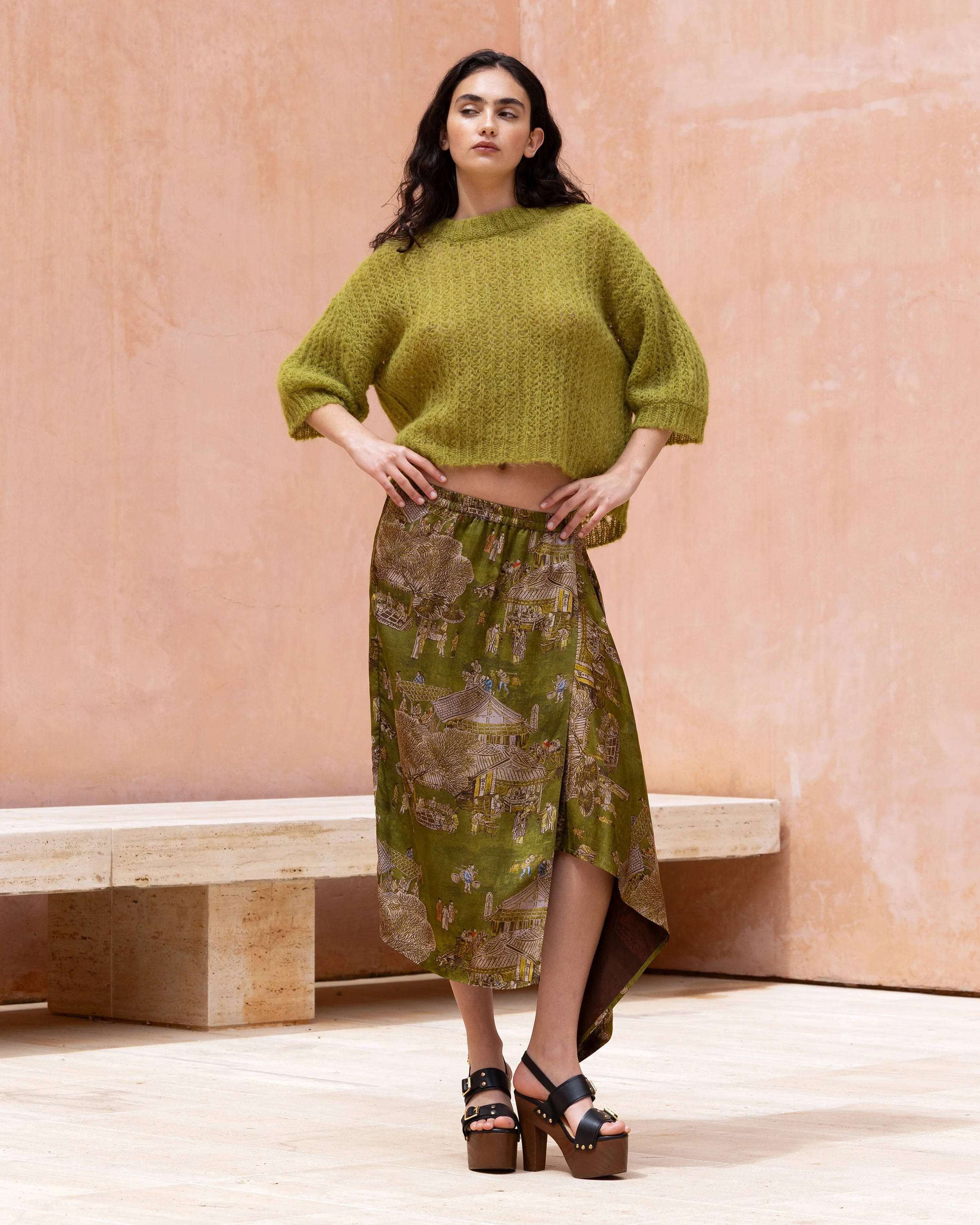 Notre jupe portefeuille joue sur l’élégance du jacquard de viscose imprimé, décliné sur un fond vert profond. Sa coupe met en valeur un pan asymétrique sur le devant, qui apporte du mouvement et une touche contemporaine. Fermée à l’intérieur pour un maintien discret et confortable, elle conjugue allure structurée et féminité subtile.