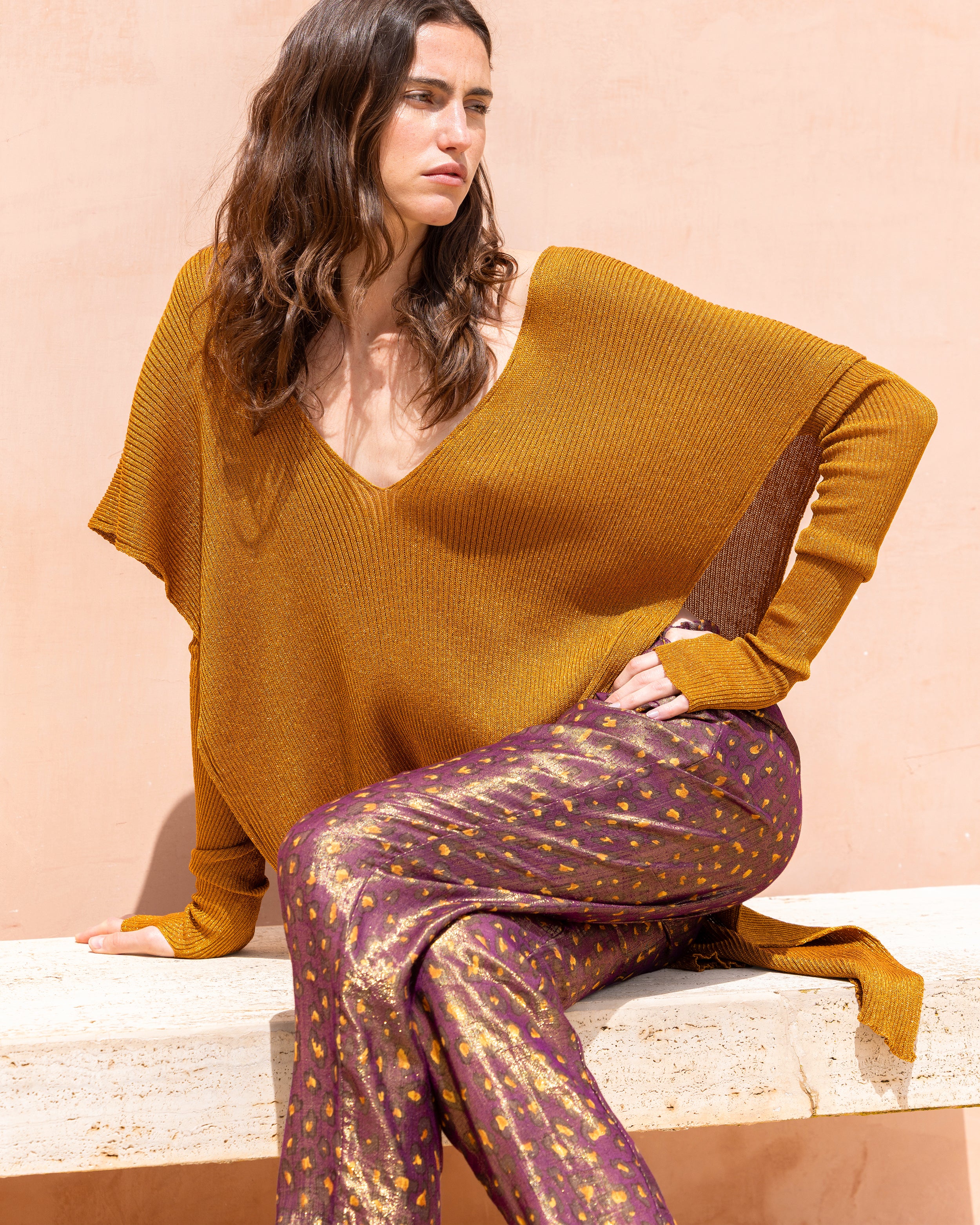 Ce pantalon allie confort et style avec sa composition en viscose douce et lurex subtil. Son fond de base violette est sublimé par un imprimé animalier délicat dans des tons ocre, créant un contraste élégant et raffiné. La coupe droite et souple assure une silhouette fluide et décontractée, tandis que la taille élastique et les poches latérales ajoutent un côté pratique et facile à porter.