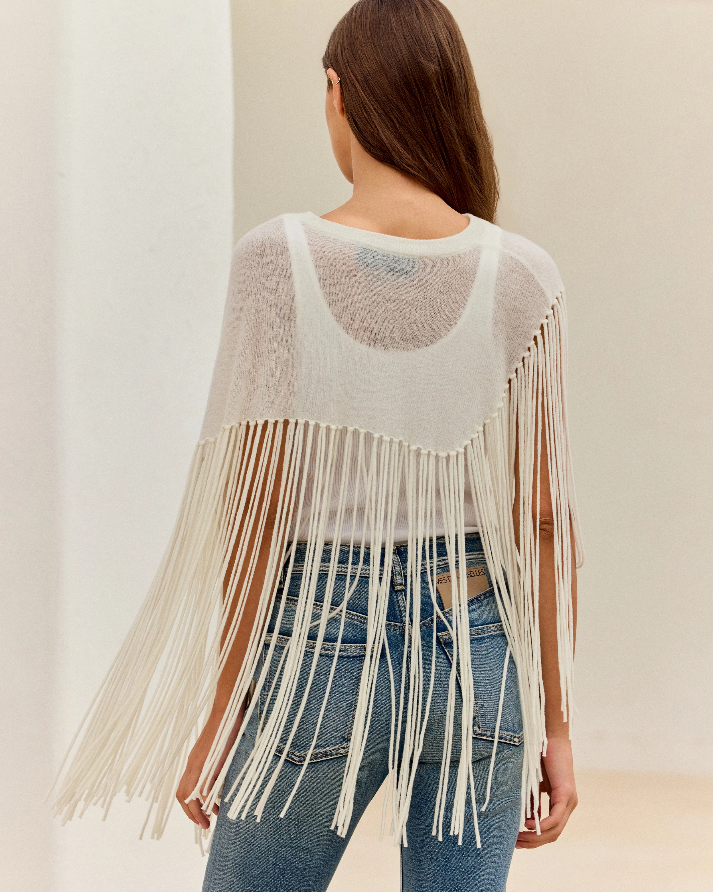 Réalisée dans un mélange de laine aérienne et duveteuse, cette cape asymétrique ivoire séduit par son jeu de longues franges apportant mouvement et modernité. Sa forme douce épouse le corps avec élégance, tandis que le col rond ras du cou structure l’ensemble. Une pièce à la fois douce et audacieuse, parfaite pour superposer sur une chemise ou une robe, pour un look raffiné.