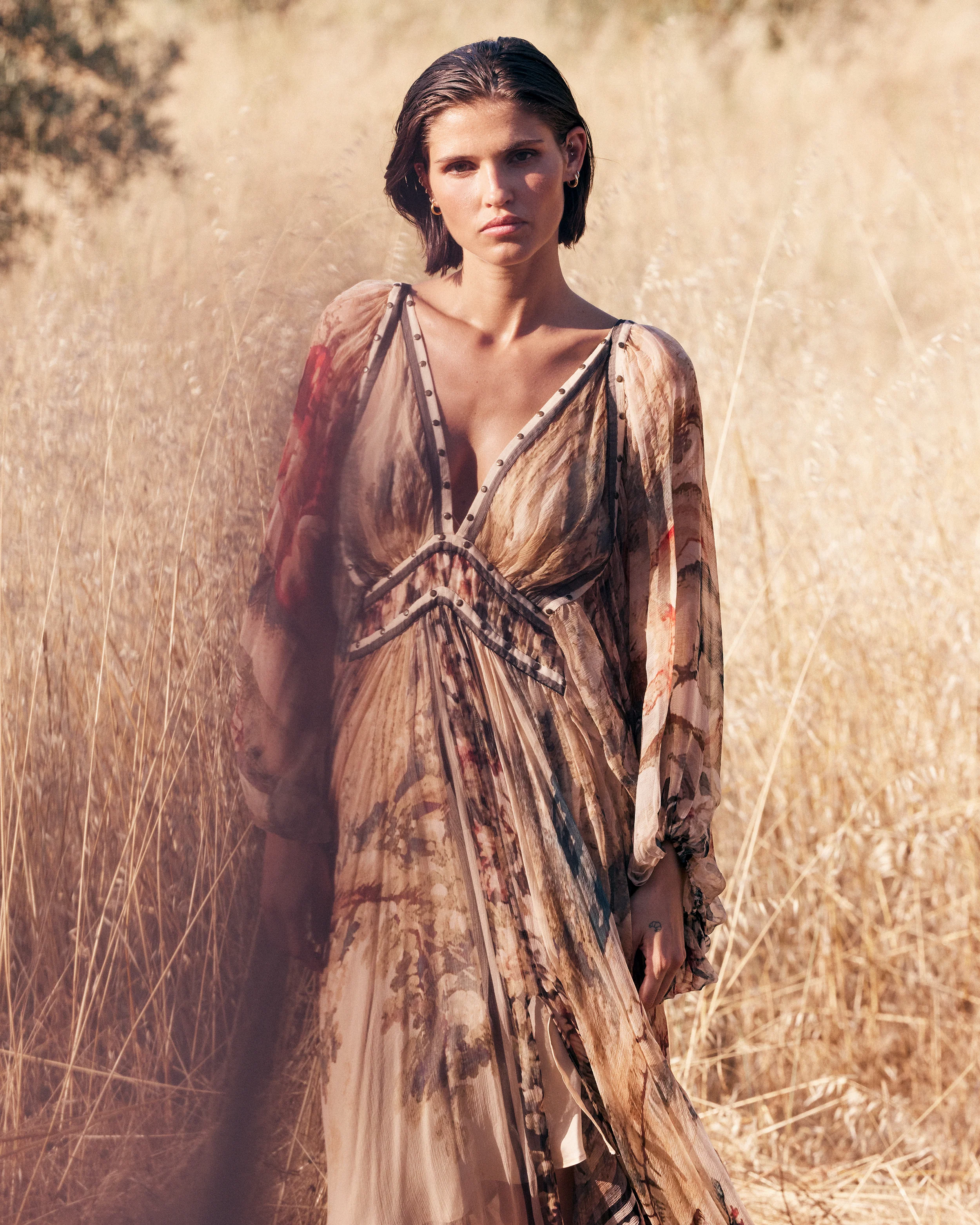 Un esprit bohème magnifié par la richesse des détails. Cette robe longue en viscose chiffon dévoile un imprimé baroque sur fond écru, comme un tableau en mouvement. Sa coupe ample, souple et asymétrique offre une allure à la fois libre et affirmée. Des clous délicatement posés viennent ponctuer l’encolure, le buste et le dessous de poitrine, dessinant la silhouette avec éclat. Les manches larges, transparentes, resserrées par un élastique au poignet, laissent subtilement entrevoir le bras à travers une ouverture discrète. À l’arrière, deux pans volantés apportent un jeu de volume poétique et inattendu. Entièrement doublée pour plus de confort, cette robe révèle un équilibre parfait entre romantisme, sophistication et audace.