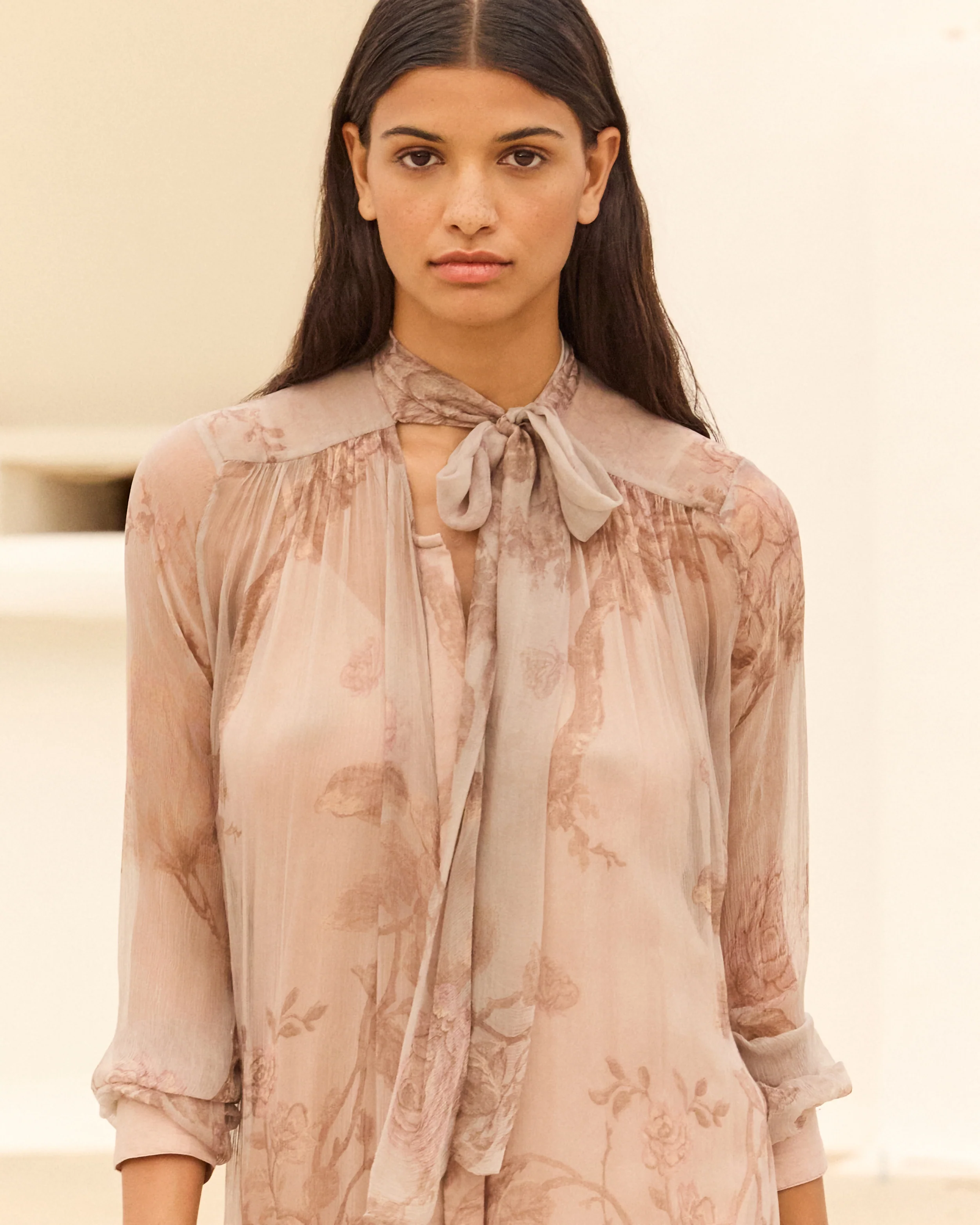 Cette robe chemise rose poudré fluide en viscose chiffon transparente incarne l’élégance vaporeuse et romantique. Son motif floral délicat, relevé d’un léger dégradé tie & dye sur le bas, lui confère une allure poétique et raffinée. Le col lavallière apporte une touche féminine et sophistiquée, tandis que sa doublure en coton tie & dye indépendante offre confort et contraste subtil. Les manches longues légèrement transparentes et la coupe ample et fluide subliment la silhouette tout en douceur. À porter ceinturée pour souligner la taille ou laissée fluide pour un effet bohème chic.