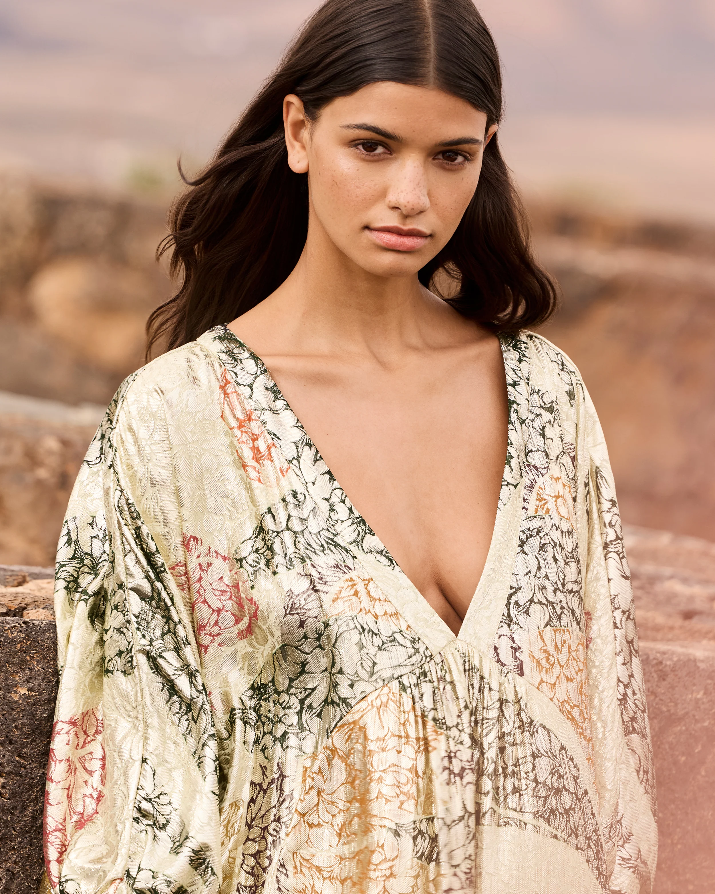 Robe caftan longue en jacquard lurex métallisé et imprimé placé multicolore, au reflet irisé et effet mouillé. Sa coupe ample et fluide est rehaussée d’un décolleté en V souple et de manches larges pour un tombé naturellement élégant. Le modèle est doté de poches à l’avant et d’une doublure séparée en coton, pour plus de confort. Une pièce au charme bohème et lumineux, idéale pour une allure décontractée et raffinée.