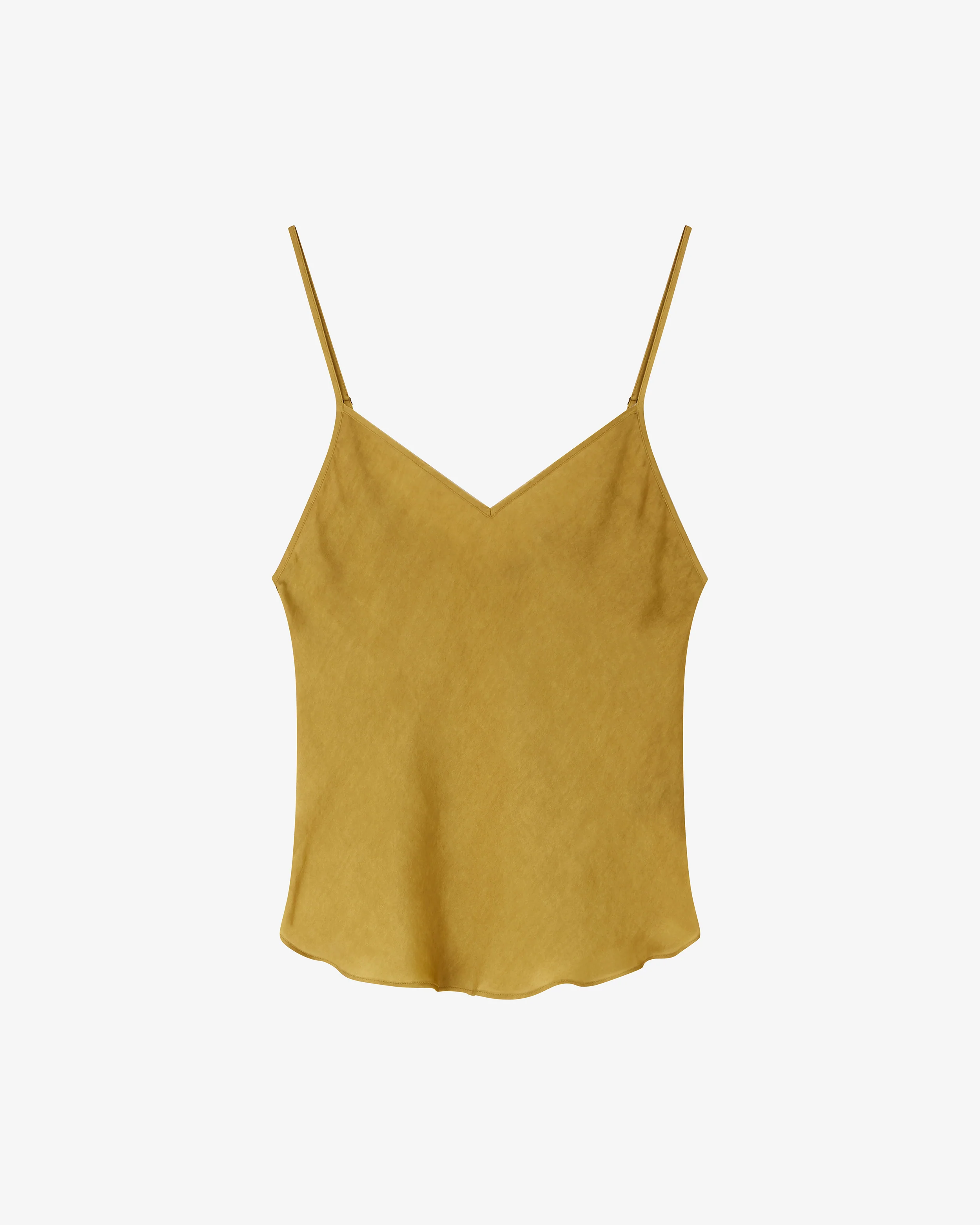 La délicatesse d’un top en soie couleur ocre, à la coupe épurée. Fines bretelles réglables, encolure en V et ligne ajustée qui épouse subtilement le corps. Légèrement évasé sur le bas pour tomber naturellement sur les hanches. Une pièce essentielle, à la fois sensuelle et minimaliste.