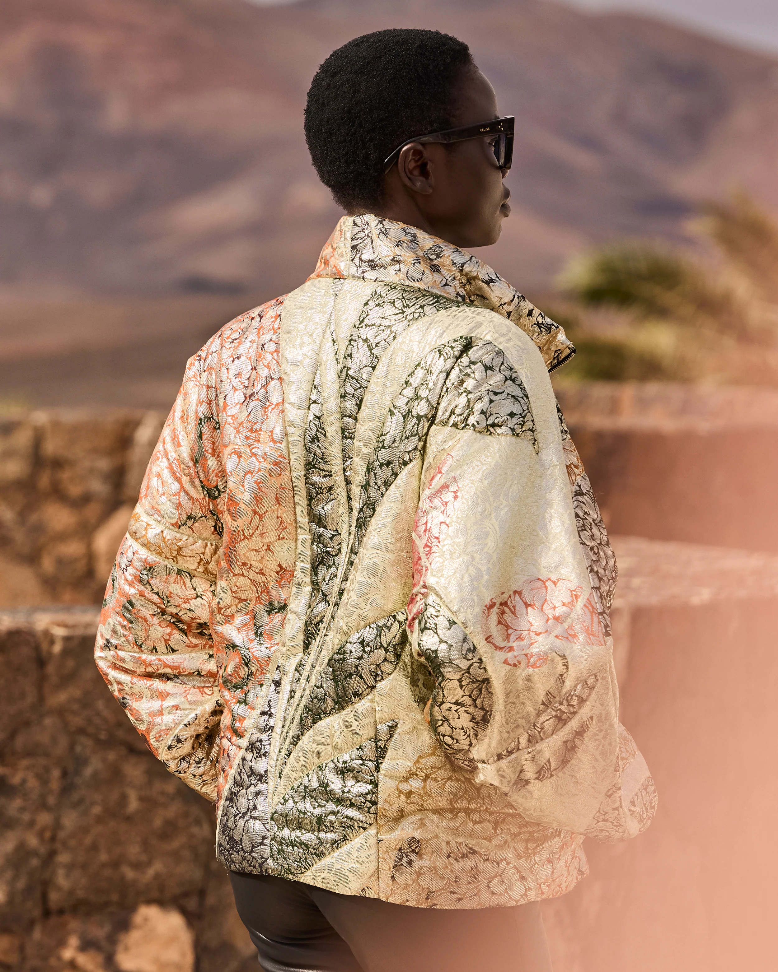 Veste courte en jacquard lurex métallisé multicolore, au motif imprimé placé et aux dessins en relief pour un effet texturé unique. Le modèle est doublé et matelassé, avec une doublure en jersey noir pour plus de confort et de chaleur. Il présente un zip sur l’avant, des poches discrètes dans la couture côté, et un système de resserrage intérieur avec cordon élastique pour ajuster la silhouette. Une pièce au caractère affirmé et contemporain, qui associe matières précieuses et esprit sport chic.